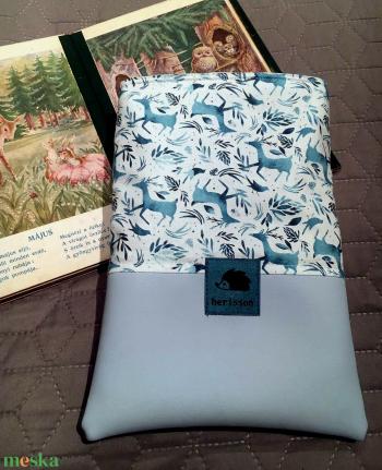 Szarvasos könyvtasak az erdő szerelmeseinek. Baba-kék textilbőr és amerikai designer pamutvászon kombinációja. Mérete 21 x 28 cm, puha, vatelinnel bélelt.