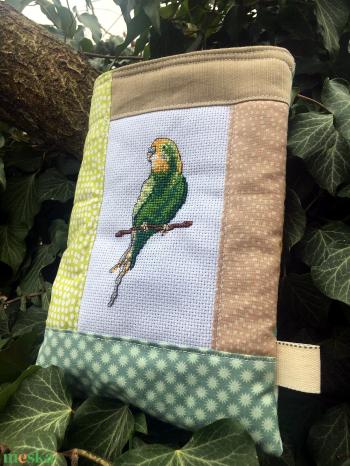 Biztonságos helyen tárolható-szállítható az éppen olvasott könyved, az e-book-od vagy a tableted. Patchwork technikával készült, amerikai designer pamutvásznak felhasználásával. A zöld kis keresztszemes hullámos papagáj édesanyám munkája :) Puha, vatelinnel bélelt. Mérete: 18 x 24 cm . 40 fokon, kifordítva mosható. Vasalható, de csak alacsony hőfokon, nehogy elolvadjon a vatelin és elveszítse a puhaságát a tasak!